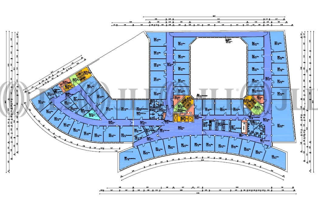 Das 6-geschossige Bürohaus setzt sich aus drei unterschiedlichen, miteinander verbundenen Bauteilen zusammen und ist durch das charakteristische Halbrund seiner beiden Seitenflügel gekennzeichnet. Die moderne Fassade, eine Kombination aus Glas und Natursteinelementen, verleiht dem gesamten Komplex eine repräsentative und zeitgemäße Ausstrahlung. Im Inneren bieten die Büroetagen flexible und effizient geschnittene Grundrisse, die sich für verschiedenste Nutzungskonzepte eignen. Große Fensterflächen gewährleisten eine hervorragende natürliche Belichtung und schaffen eine helle, produktive Arbeitsatmosphäre.