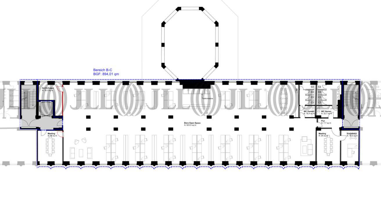 In dem 1927 erbauten, denkmalgeschützten Postgebäude befindet sich eine abwechslungsreiche Struktur aus geschlossenen Büro- und offenen Openspace-Bereichen. Über den zentralen Zugang gelangt zum großen Treppenhaus und den Fahrstühlen, welche zu den Büroeinheiten führen. Durch die offenen Grundrisse und die Verwendung von vielen Glaselementen ist die Einheit angenehm hell und einladend. Die Grundrissgestaltung kann individuell nach den Anforderungen der Mieter angepasst werden. Im Objekt befindet sich zudem ein Coworkingcenter, indem zusätzliche Flächen, wie z. B. Konferenzräume, angemietet werden können.