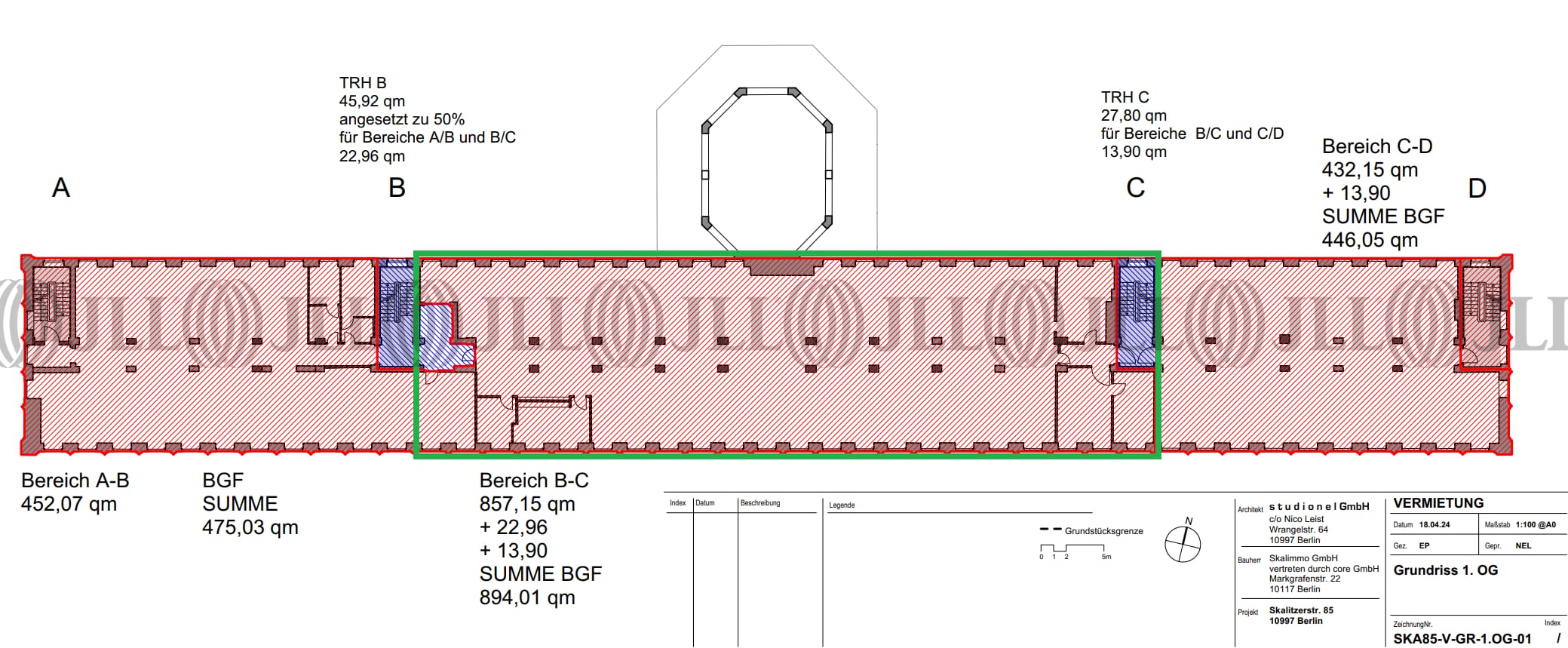 Die Innenstruktur der Räumlichkeiten im Neubau kann komplett nach den Bedürfnissen der zukünftigen Mieter angepasst werden. Die Etagen haben eine Gesamtmietfläche von etwa 1.032,00 m² BGF und können bei Bedarf weiter unterteilt werden. Zusätzlich gibt es im Dachgeschoss zwei separate Terrassenflächen mit einem beeindruckenden Blick über die Stadt.