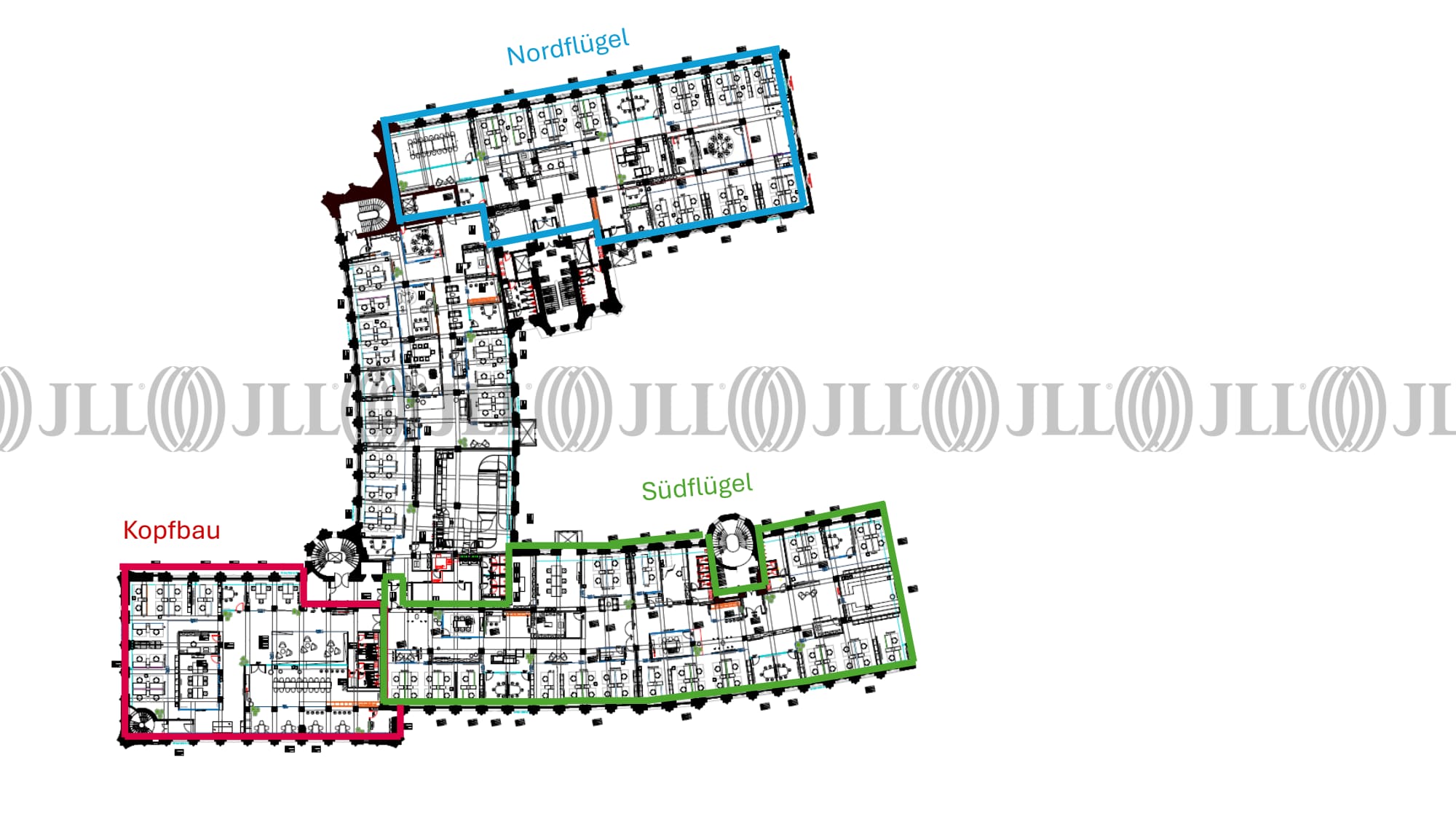Zur Vermietung steht entweder eine möblierte Fläche im 4. OG Variante A Nordflügel mit ca. 1.035 m² ODER im 4. OG Variante B Südflügel mit ca. 1.969 m². Die Anmietung des Mobiliars ist Bestandteil des Mietvertrags. Die vakante Fläche kann im Rahmen eines Untermietvertrages angemietet werden.