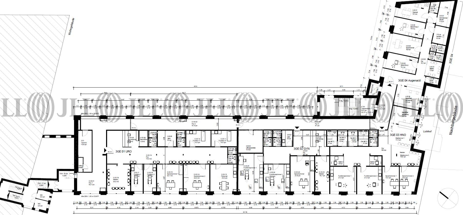 Das Objekt bietet zwei freie helle Mietflächen, die sich aktuell noch im Rohbau befinden. Dabei handelt es sich um eine Fläche im 2. Obergeschoss mit ca. 360 m² und eine Fläche im 3.Obergeschoss mit ca. 380 m². Je nach spezifischen Bedarf und Wünschen des Interessenten können die Flächen ausgebaut werden. Die einzelnen Etagen sind durch Treppenhäuser und Aufzüge erschlossen, der Zugang erfolgt barrierefrei. Aktuell weist die Mieterschaft des Objektes eine medizinische Orientierung auf. Der Eigentümer favorisiert die Vermietung an Ärzte, Therapeuten o.ä.