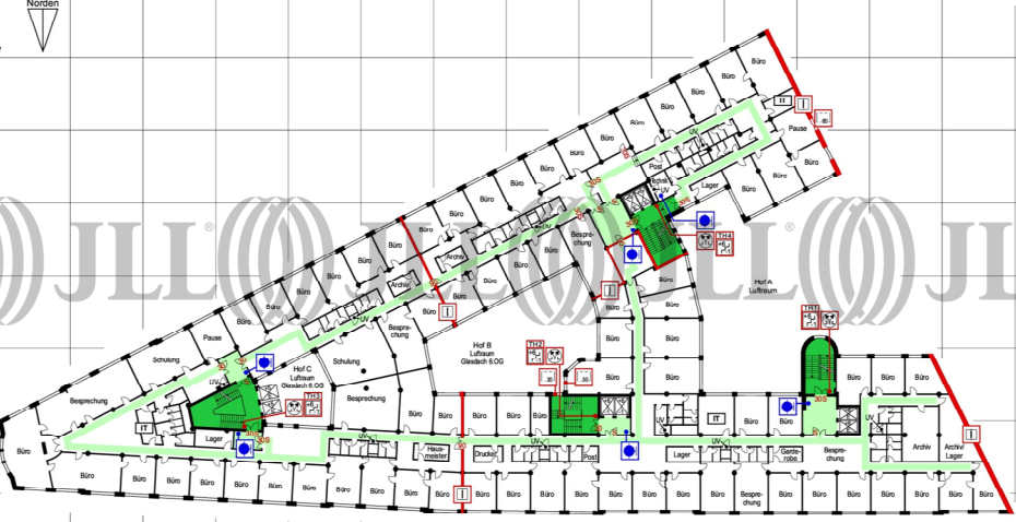 Aktuell stehen attraktive Büroflächen zur Verfügung. Im ersten Obergeschoss finden Sie eine großzügige Fläche von ca. 3.675 m², die ab ca. 1.200 m² teilbar ist und vielfältige Gestaltungsmöglichkeiten für Ihr Unternehmen bietet. Zusätzlich steht im dritten Obergeschoss eine Fläche von ca. 712 m² zur Verfügung, die direkten Zugang zu einer Terrasse bietet.