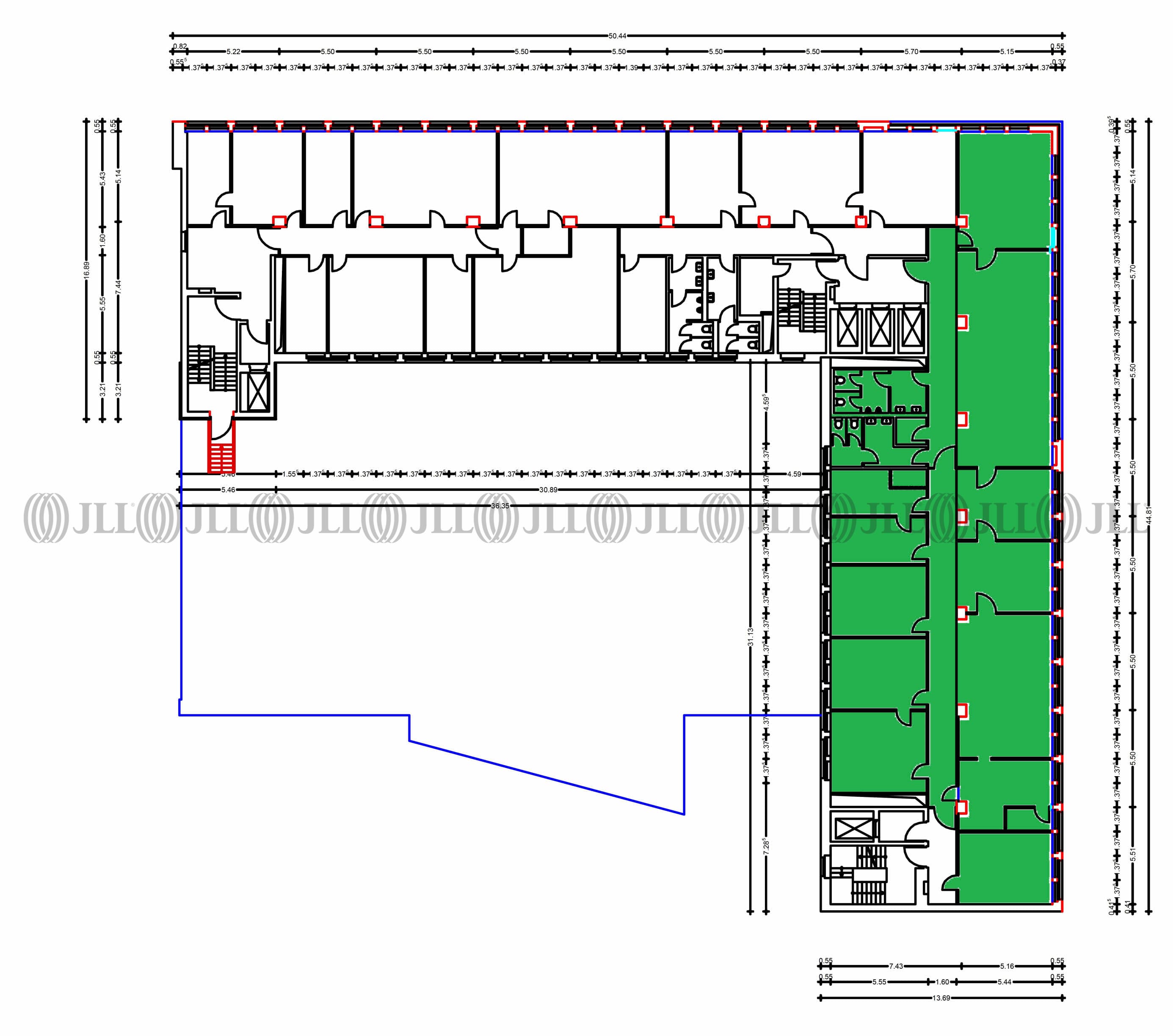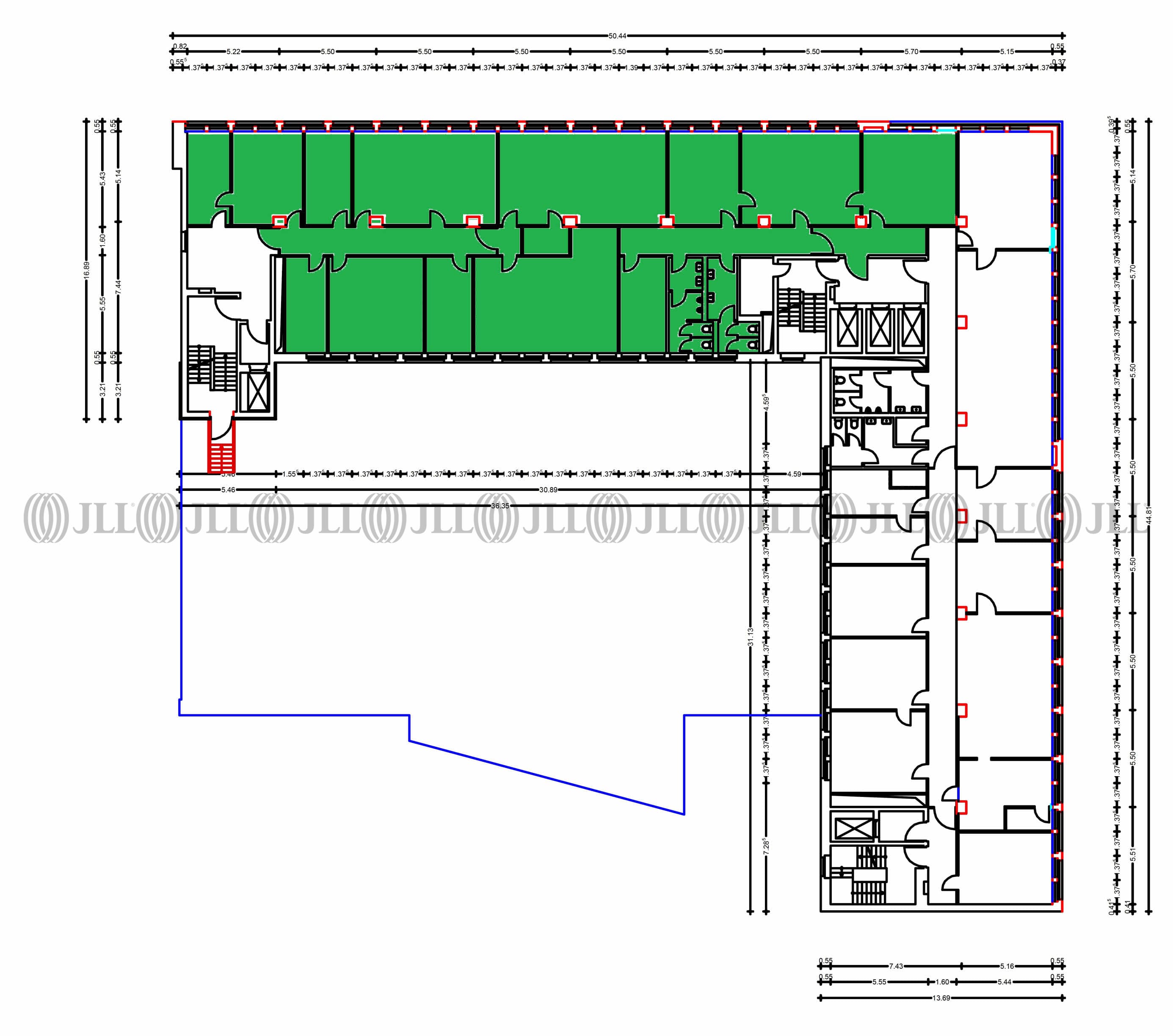 Das L-förmig geschnittene Bürohaus verfügt über eine Stein-Glasfassade und lässt aufgrund seiner zwei Treppenhauskerne eine kleinteilige Aufteilung zu. Die zur Verfügung stehenden Flächen bieten einen hervorragenden Ausblick über Neuss.