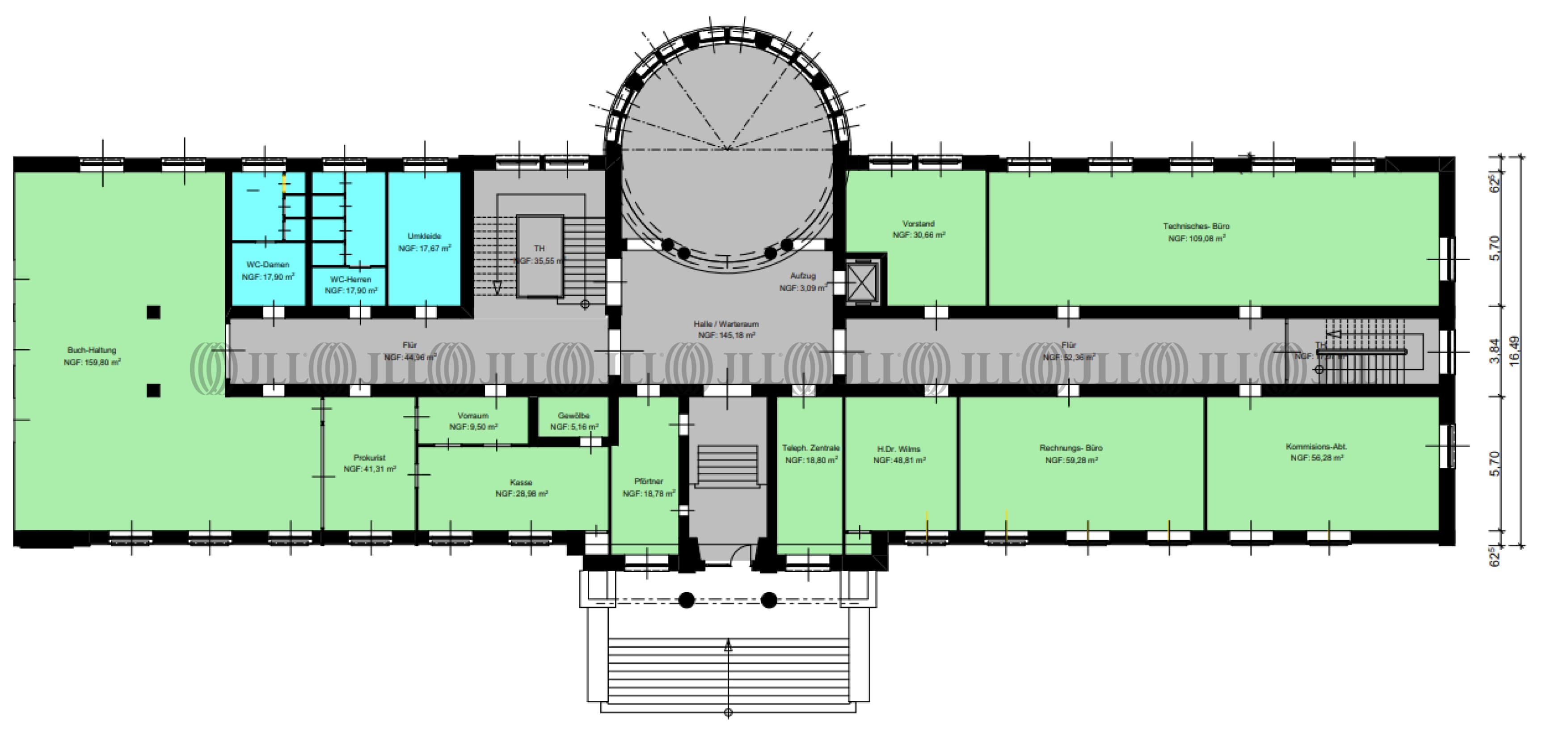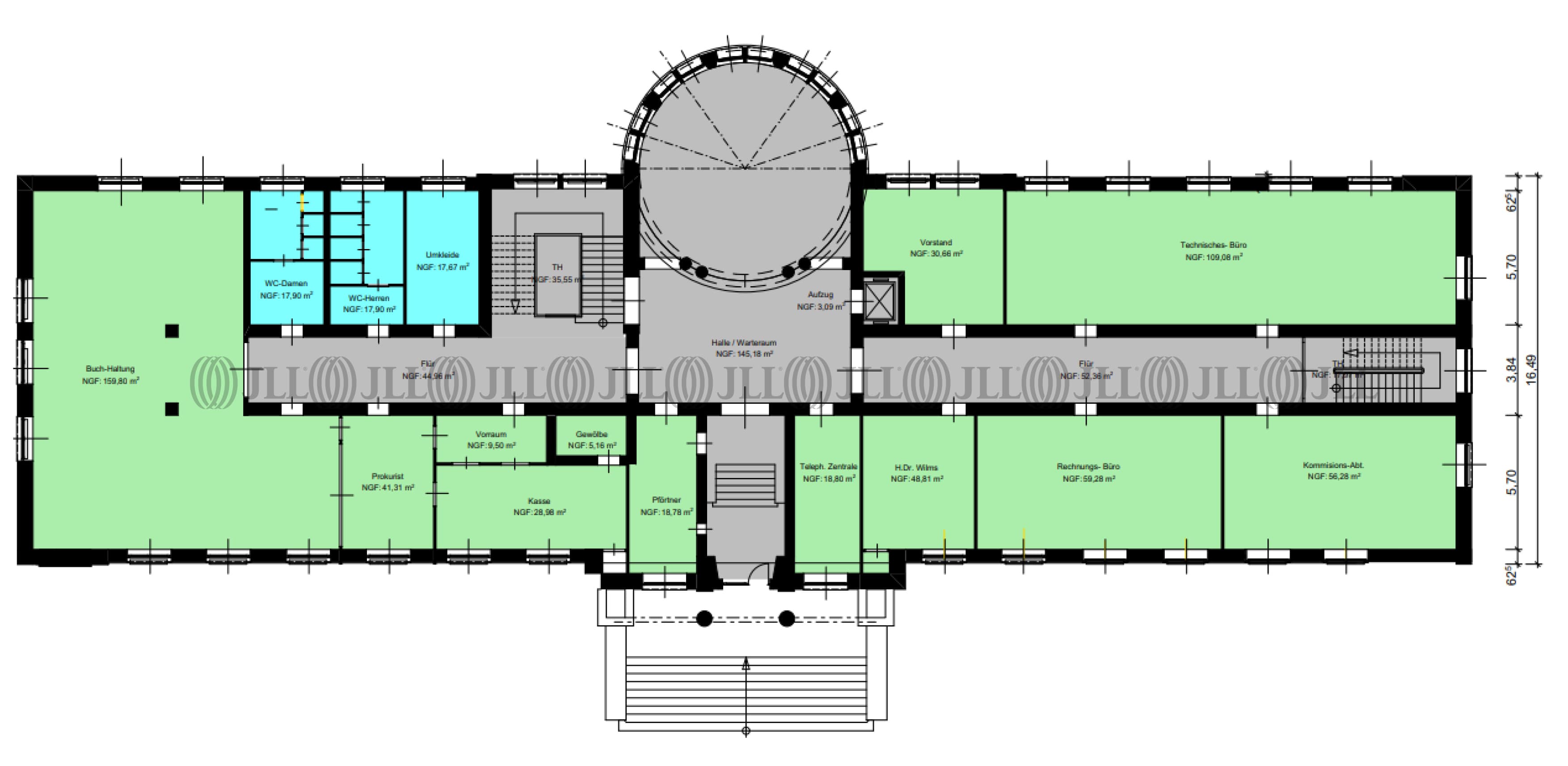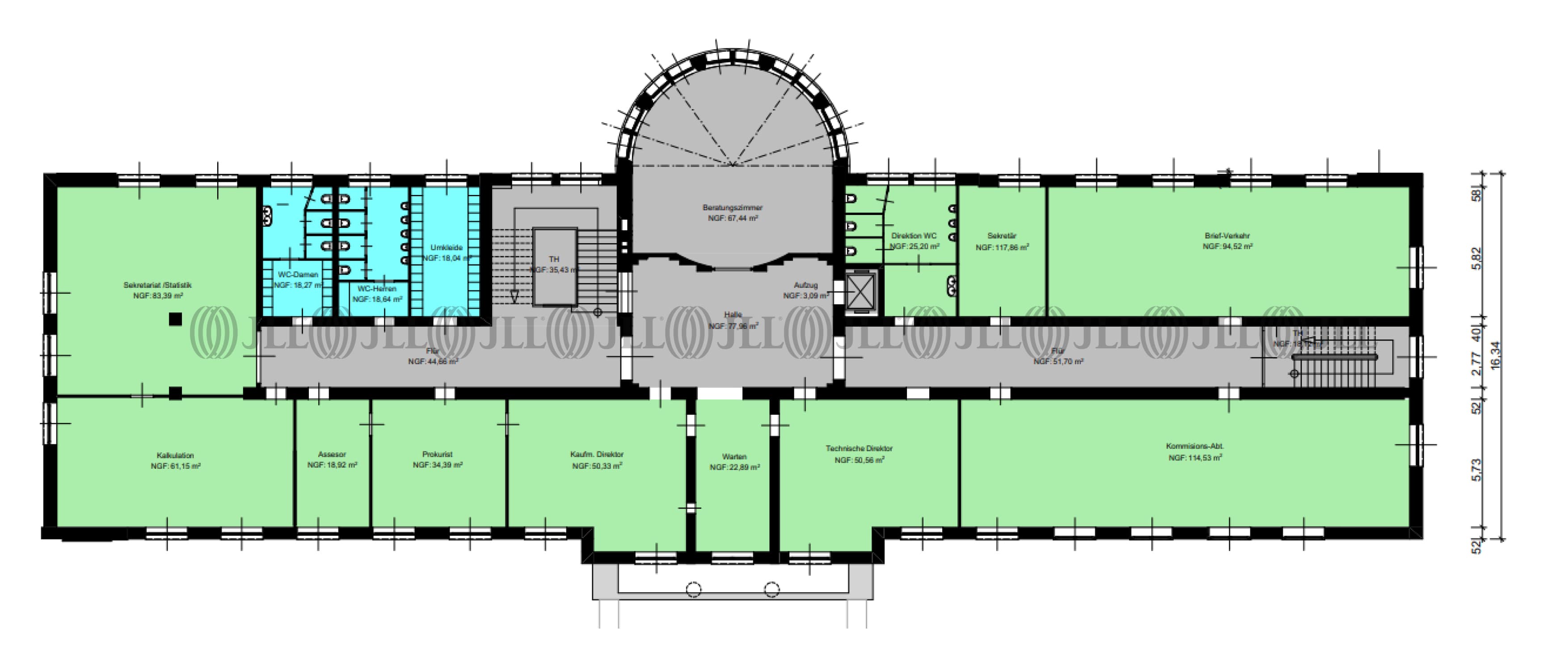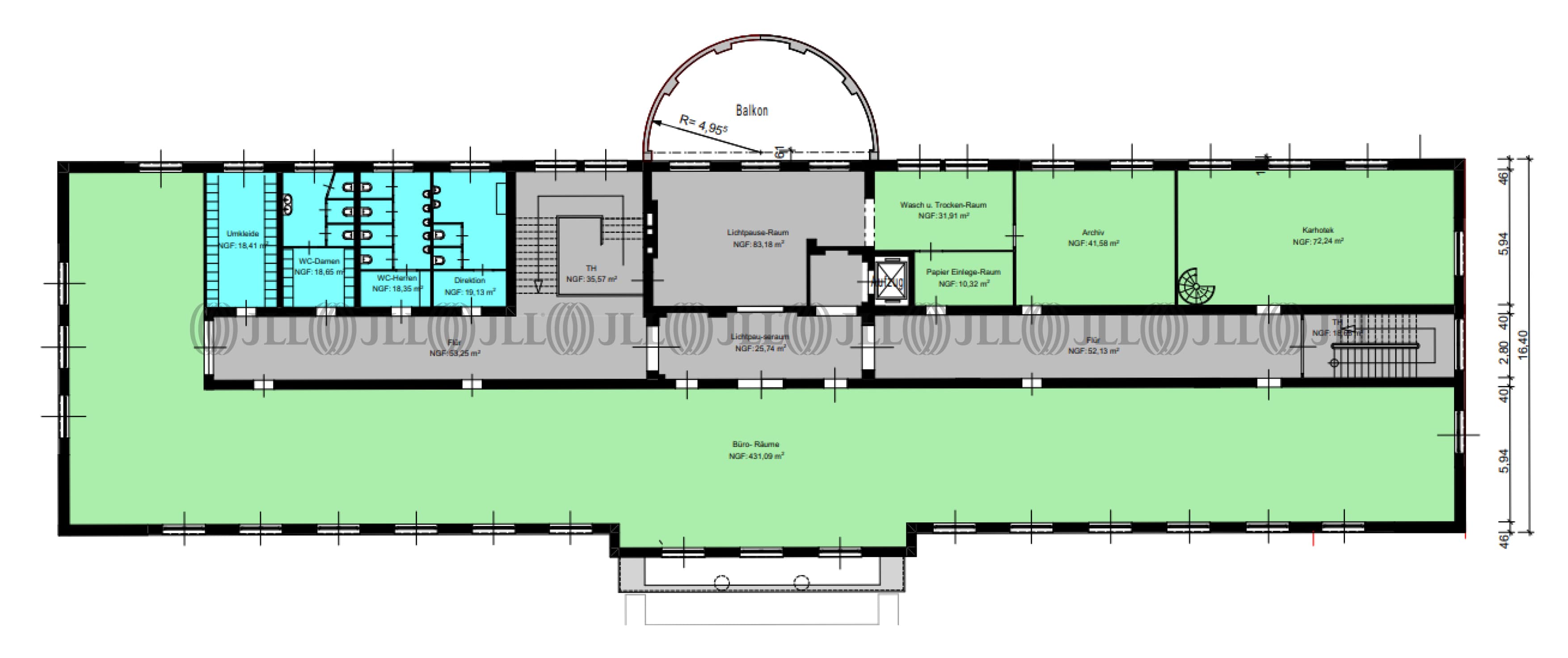 Der 5-geschossige Verwaltungsbau aus dem Jahr 1929 überzeugt durch seine repräsentative und gleichzeitig effiziente Architektur. Die Büroflächen verfügen teilweise über Verzierungen an den 3,30 m hohen Decken und große Fensterfronten.