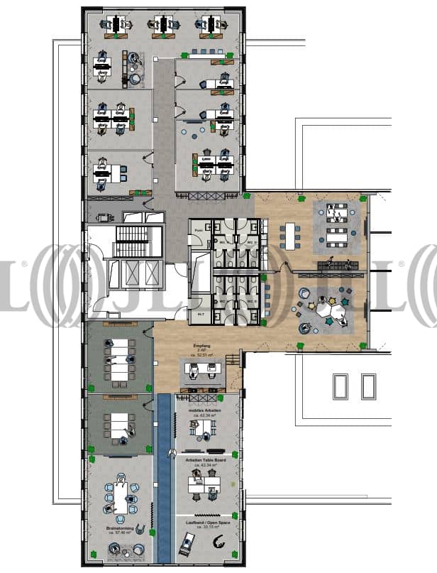 Bei diesem modernen Neubau handelt es sich um einen Büro- und Gewerbekomplex, aufgeteilt in drei Abschnitte mit einer Nutzfläche von insgesamt 12.907 m². Das Gebäude-Ensemble besteht aus drei Gebäudefingern unterschiedlicher Höhe, die auf einem gemeinsamen Sockel ruhen. Der Sockelbereich ist umlaufend verglast bzw. mit Fassadenplatten verkleidet. Die Tiefgaragenplätze werden alle mit E-Ladestationen ausgestattet.