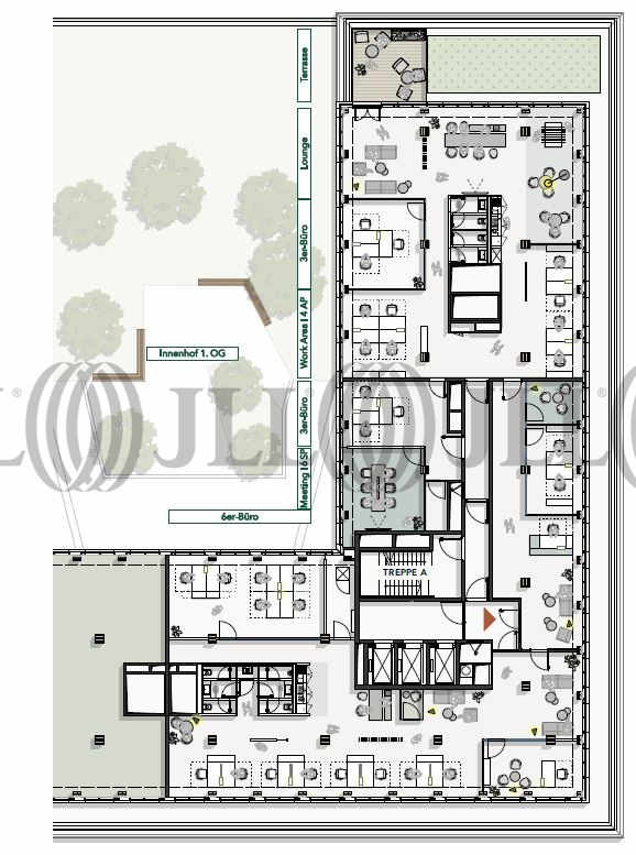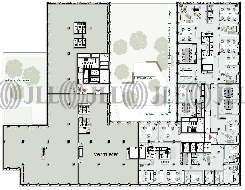 Bei dem Neubau handelt es sich um ein markant gestaltetes Bürohaus in Holzbauweise. Der Anteil wird ca. 25-30% am Gesamtgebäude betragen. Das Gebäude wird gemäß den Anforderungen der zukünftigen Nutzer ausgestattet. Im 1. OG befindet sich eine Patio mit begrünter Terrasse und im 7. OG eine begrünte Dachterrasse.