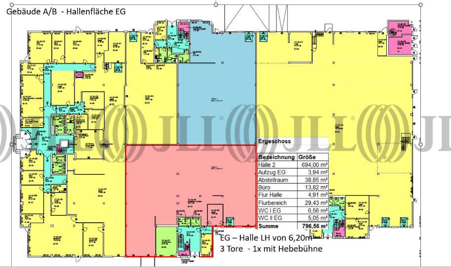Die beheizten Hallenflächen verfügen über Rolltore und werden sowohl durch Rampenanlagen als auch ebenerdig bedient. Die Bodenbelastung beträgt 5Mp/m².