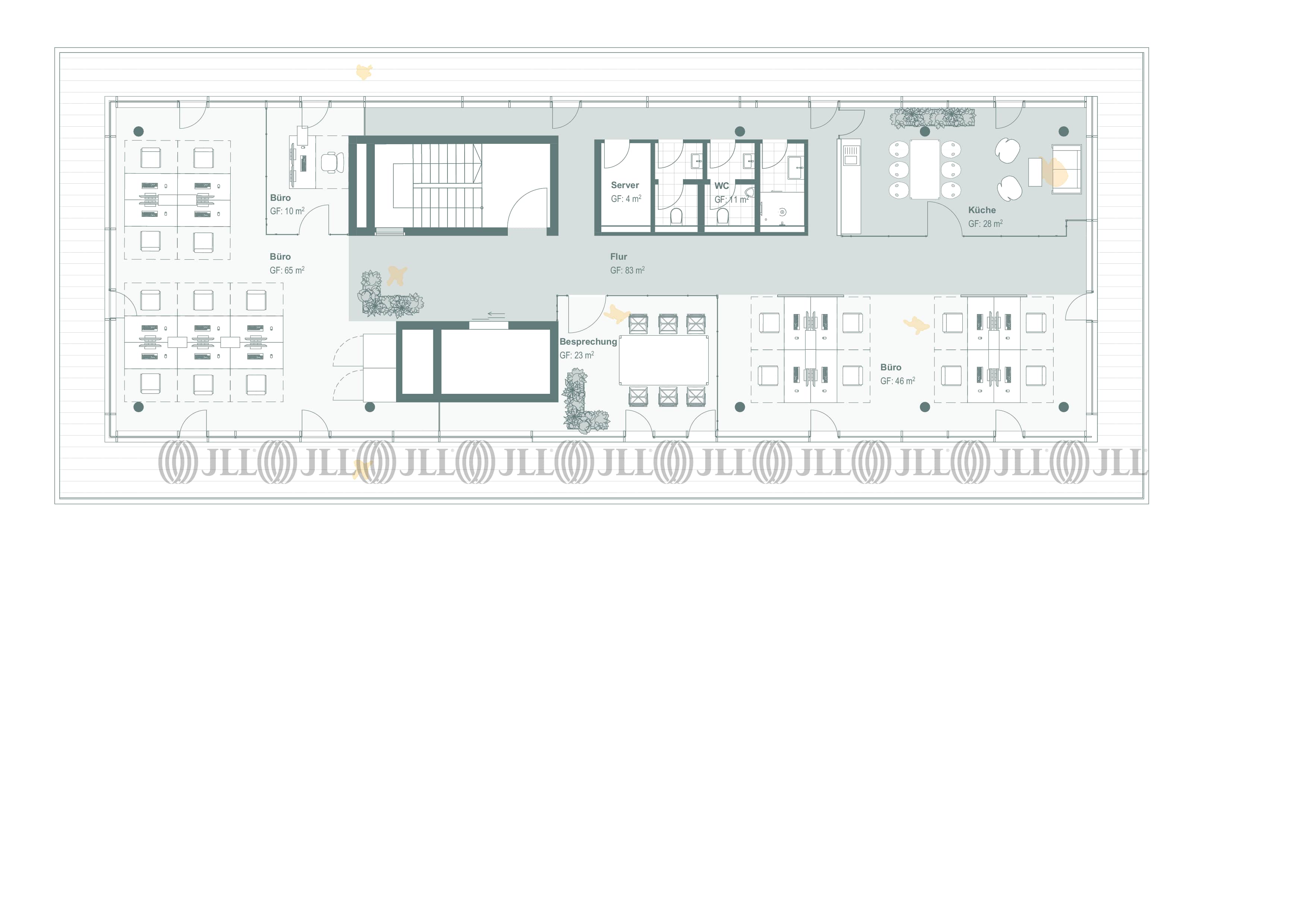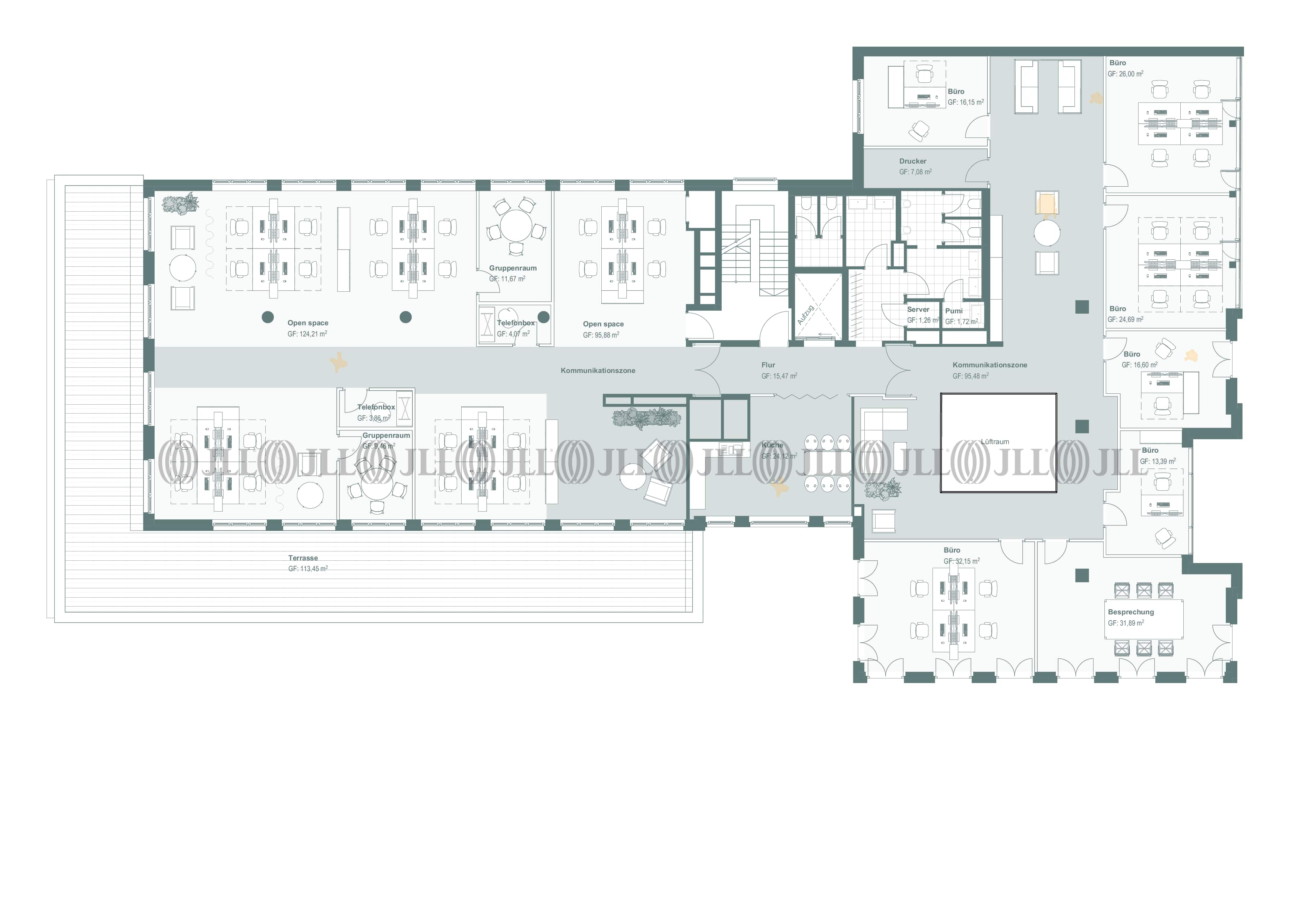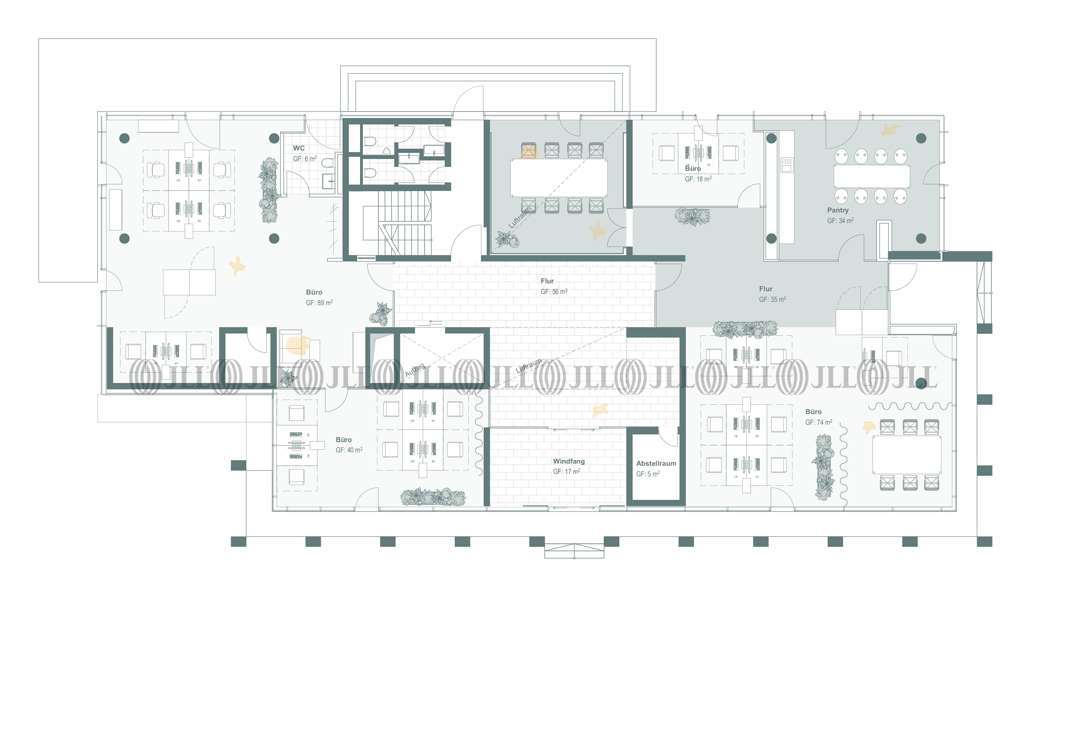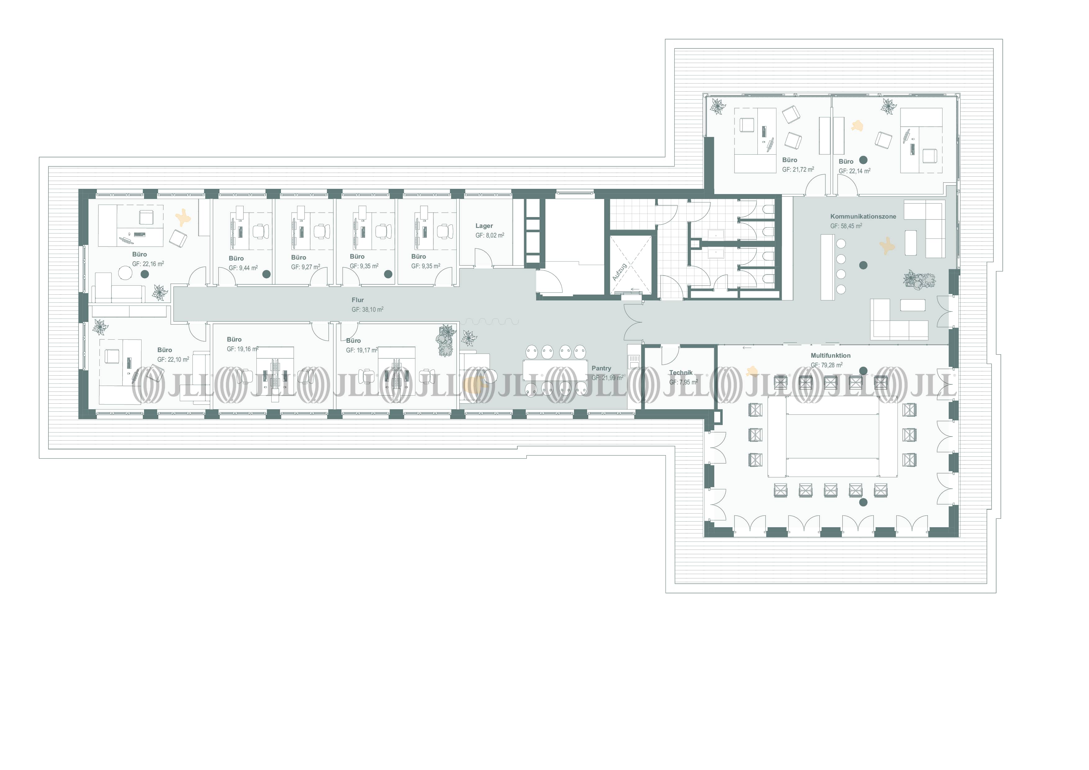 Die Flächen sind flexibel aufteilbar und bieten dank lichtdurchfluteter Räume, Glastrennwänden und hochwertigen Bodenbelägen eine ideale Grundlage für unterschiedlichste Nutzungskonzepte. Moderne Ausstattungsdetails wie Kabelkanäle für IT-Infrastruktur, Pantryküchen, getrennte Sanitärbereiche sowie eine Terrasse im Erdgeschoss runden das Angebot ab.