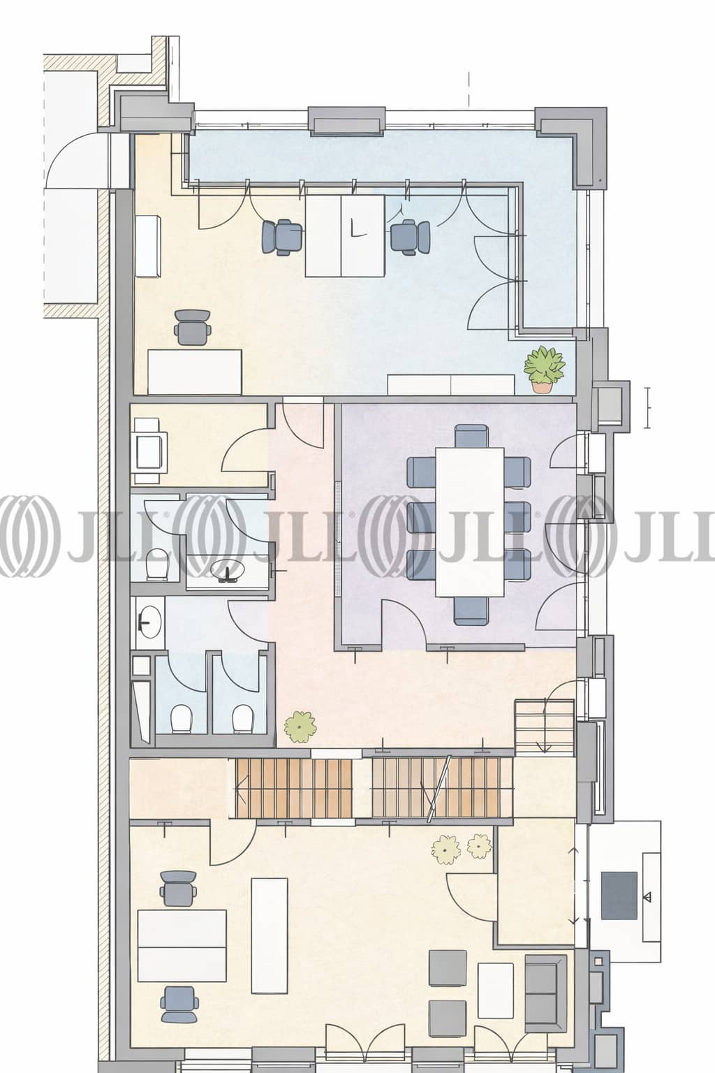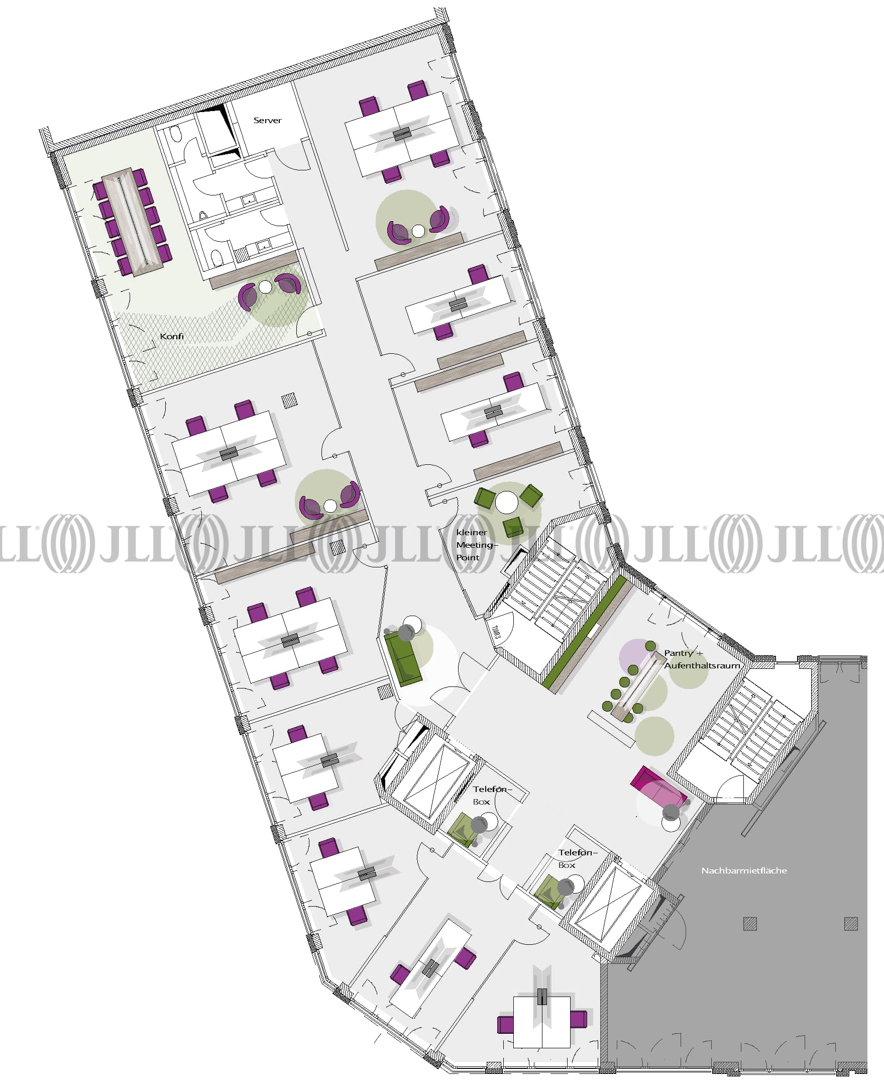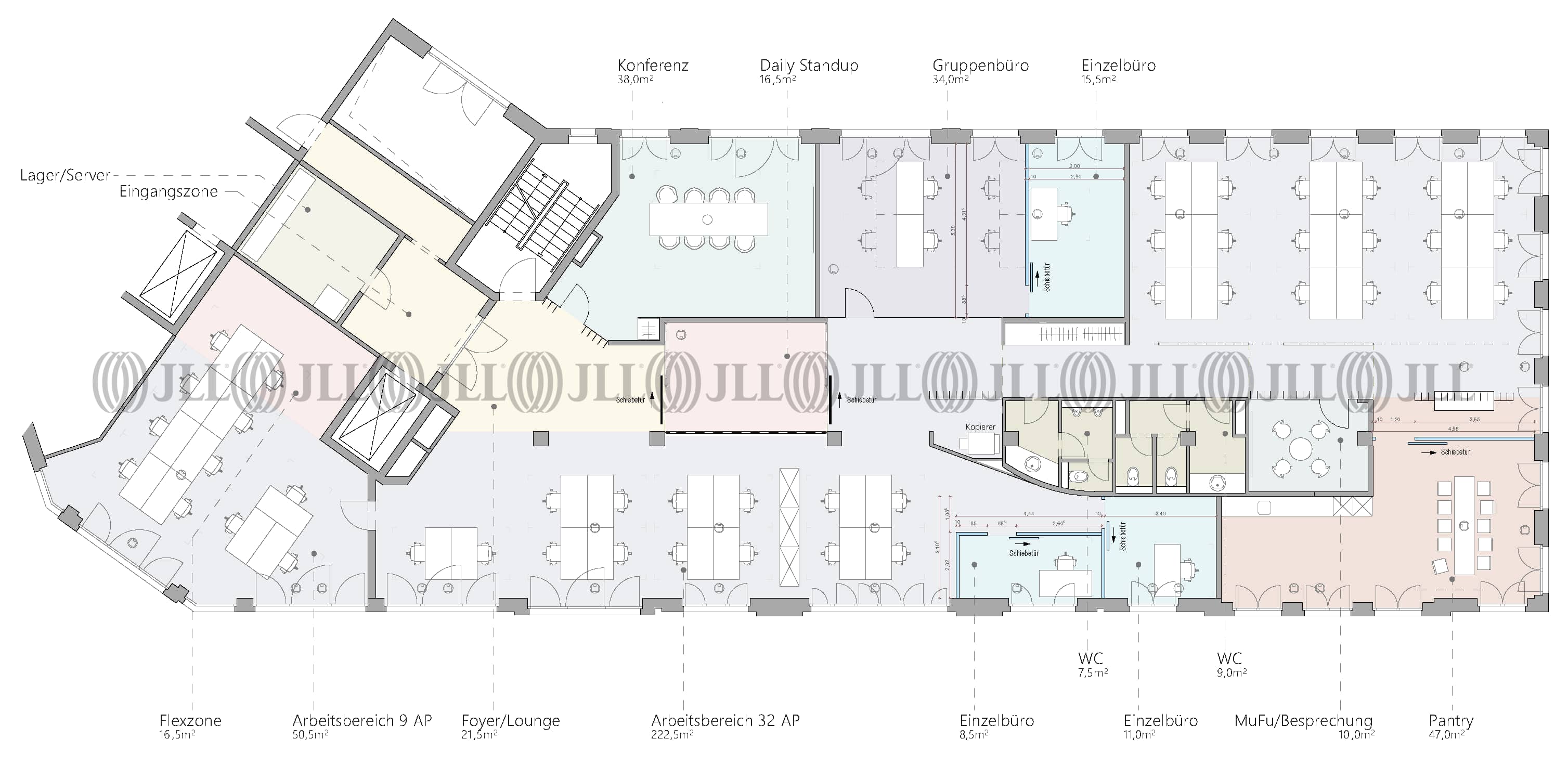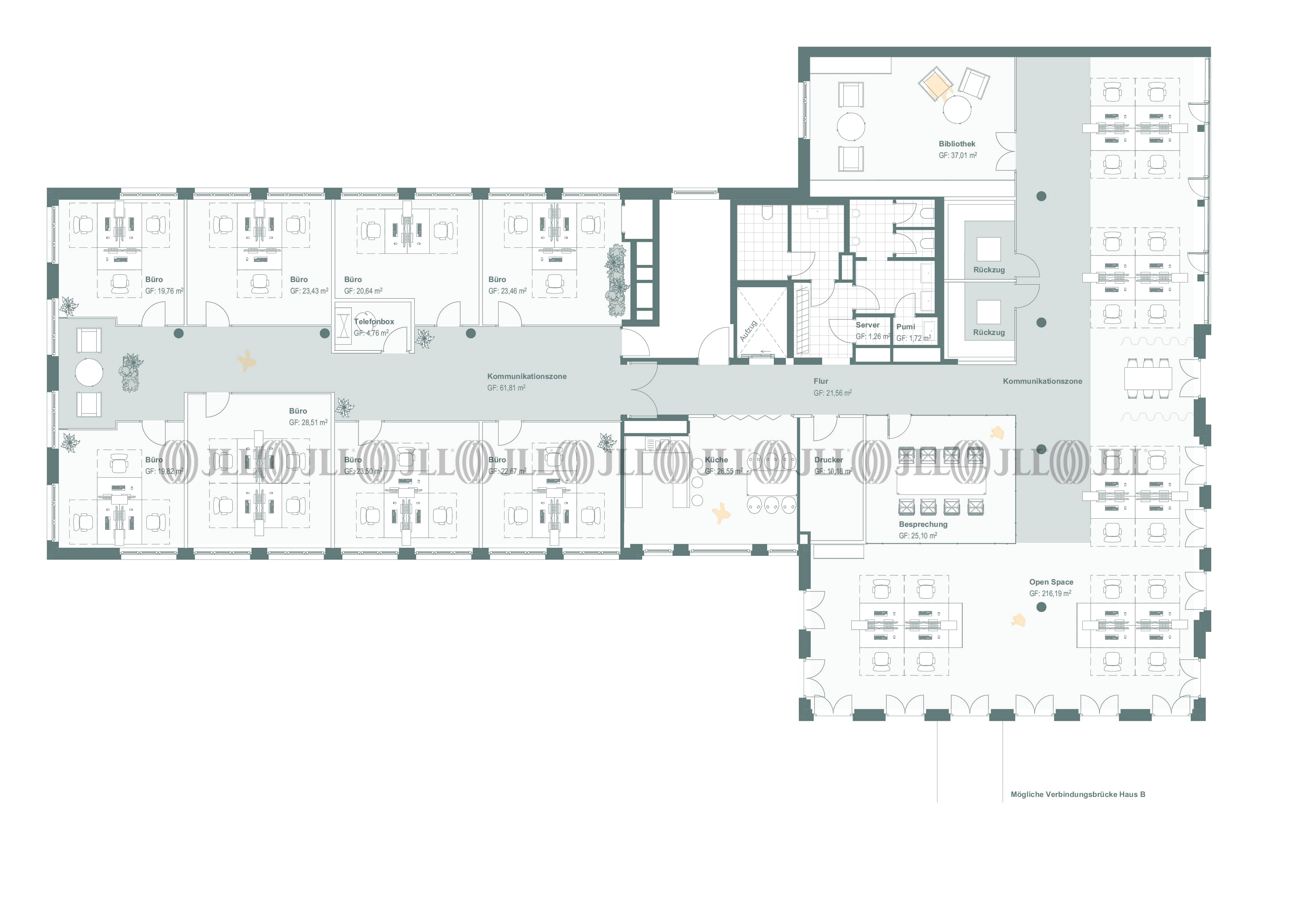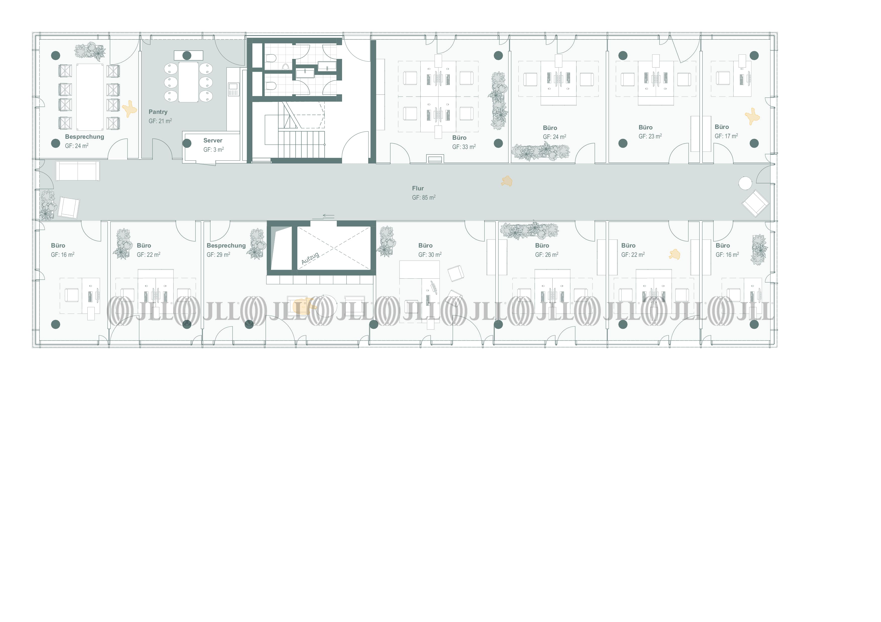 Die Flächen sind flexibel aufteilbar und bieten dank lichtdurchfluteter Räume, Glastrennwänden und hochwertigen Bodenbelägen eine ideale Grundlage für unterschiedlichste Nutzungskonzepte. Moderne Ausstattungsdetails wie Kabelkanäle für IT-Infrastruktur, Pantryküchen, getrennte Sanitärbereiche sowie eine Terrasse im Erdgeschoss runden das Angebot ab.