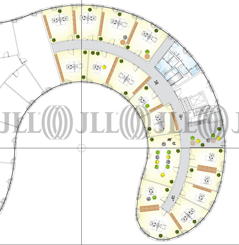 Dieses 7-geschossige Objekt wird durch seine wellenförmige Gebäudeform in Ecklage hervorgehoben und schafft so einen fließenden Übergang zum Umfeld. Der Eingangsbereich wird durch großflächige Lichtdecken erhellt, so dass eine freundliche, ganztägig helle Atmosphäre entsteht. Eine visuelle Brücke bildet der brasilianische Schiefer, der in den Eingangs- und Erschließungsbereichen verlegt ist.