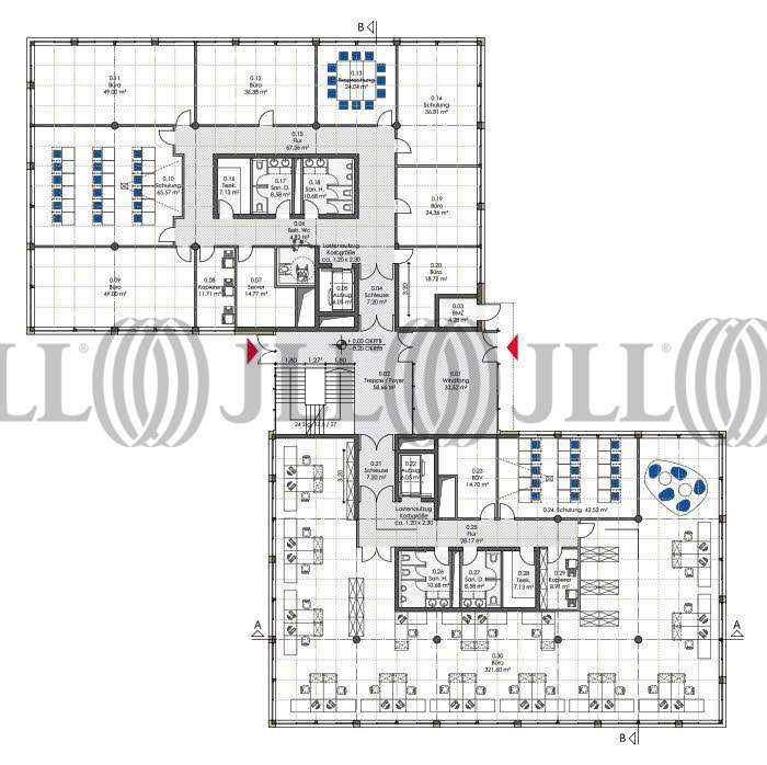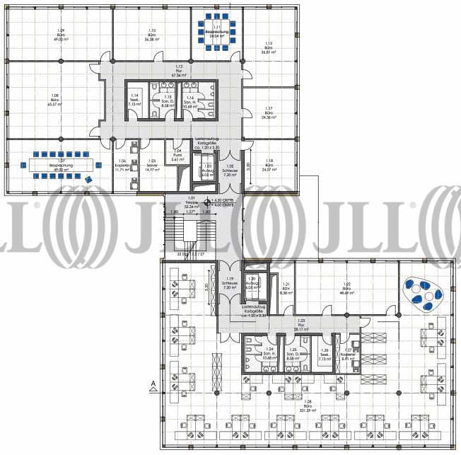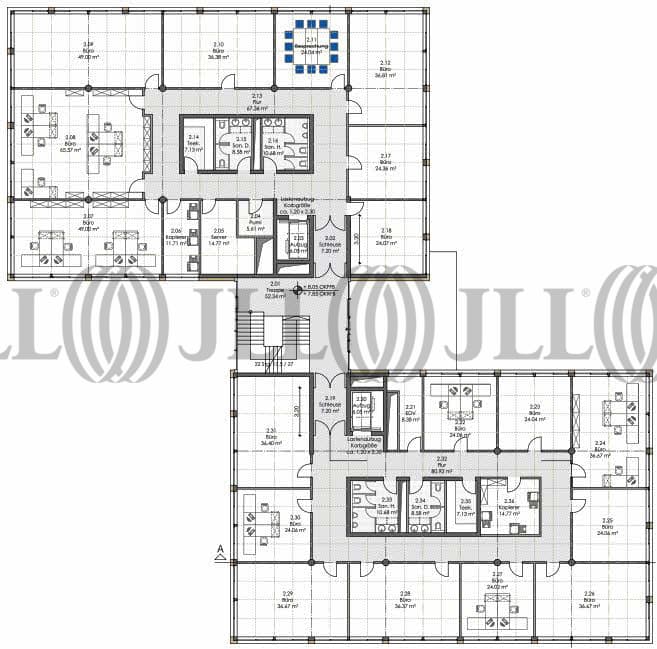 Die einzelnen Etagen des Gebäudes zeichnen sich durch eine großzügige Bürofläche von etwa 940 Quadratmetern aus, die in jeweils zwei Flügel unterteilt werden soll, um flexibel auf unterschiedliche Bedürfnisse einzugehen. Jeder Flügel bietet etwa 450 Quadratmeter Mietfläche, was sowohl kleinen als auch größeren Unternehmen die Möglichkeit gibt, den Raum an ihre Anforderungen anzupassen.