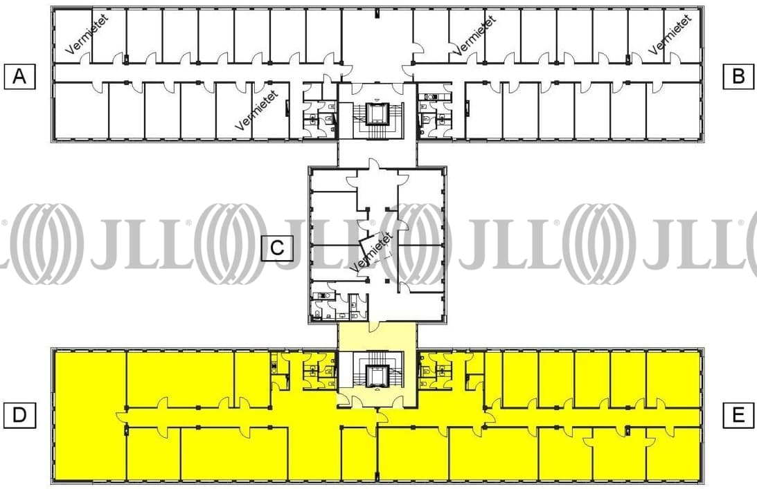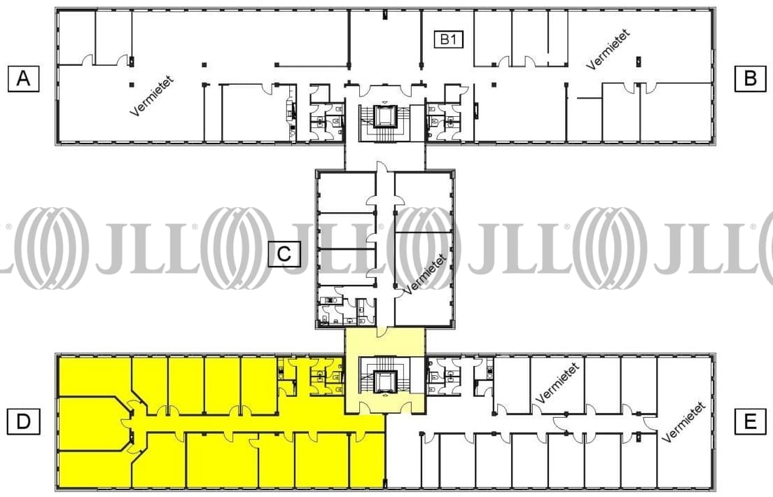 Das Bürogebäude wurde in einer 3-fachen “H-Form” erbaut und zeichnet sich mit der modernen Architektur und hohem Funktionswert aus. Das Objekt besteht aus einem Erdgeschoss und 3 Obergeschossen. Von den Treppenhausbereichen führt je ein Aufzug zu den einzelnen Etagen. Seitlich der Haupteingänge befindet sich eine Briefkastenanlage mit Klingel- und Sprechanlage. Alle Fenster von Büro- und Nebenflächen an der Süd-, Ost- oder Westseite des Gebäudes haben als außenliegenden Sonnenschutz Leichtmetalljalousetten.