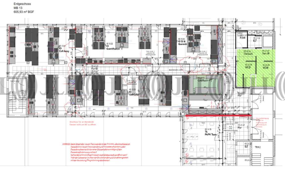 Die hier angebotenen Laborflächen sind für S2 zulassungsfähig und verfügen über diverse technische Gase, Notstrom, VE-Wasseraufbereitung und Kühlzellen. Diverse Räume bieten eine redundante Kühlung (Freezerräume). Alle Flächen verfügen über einen ausreichenden Luftwechsel (4-8 fach, je nach Klassifizierung) und sind gekühlt/klimatisiert.