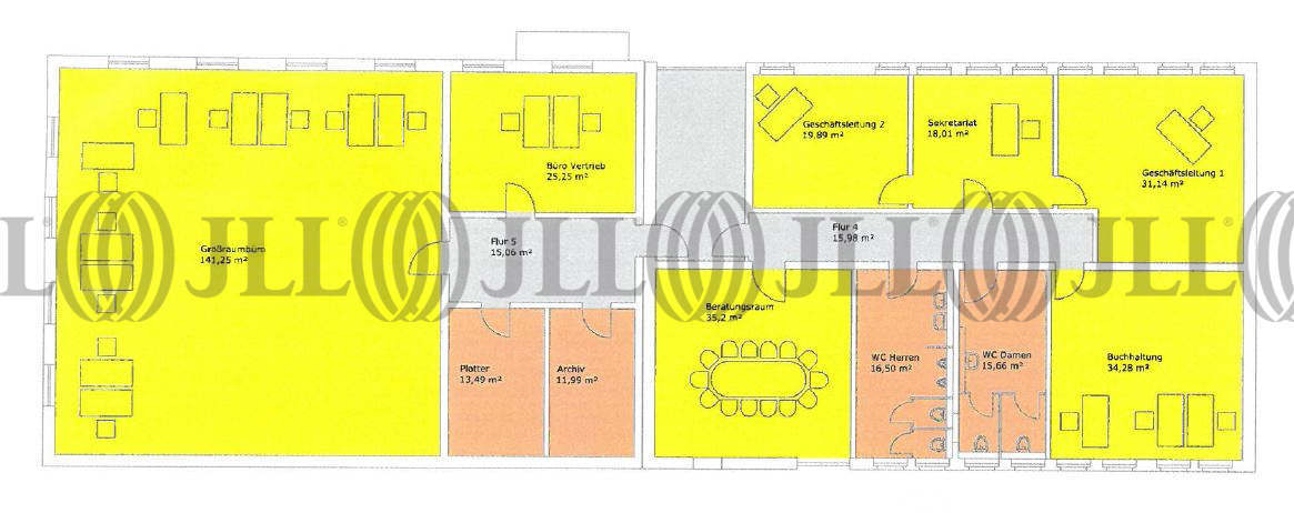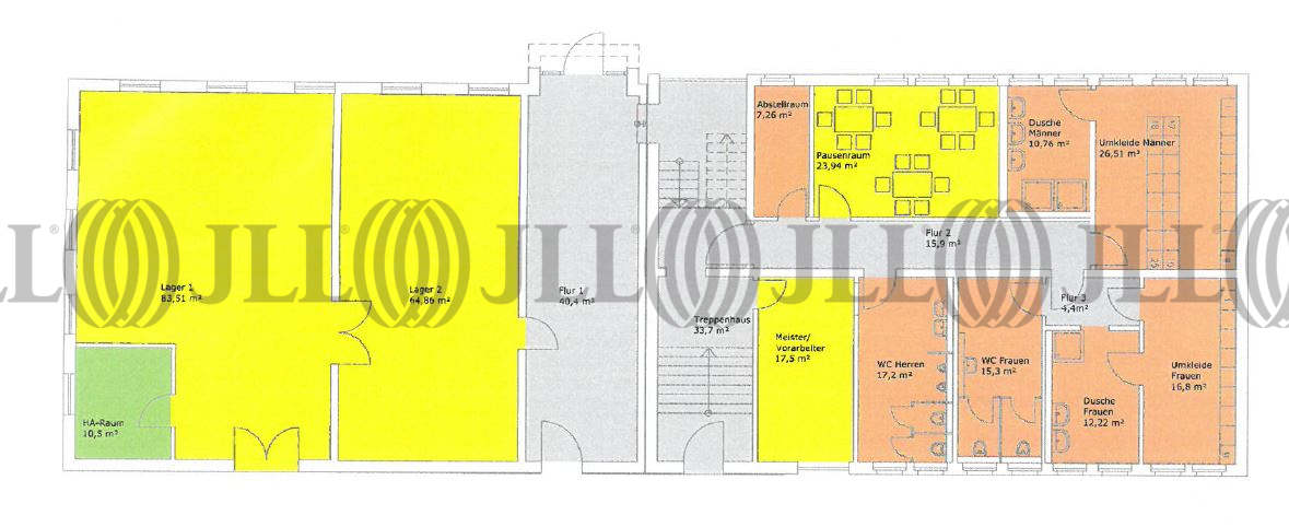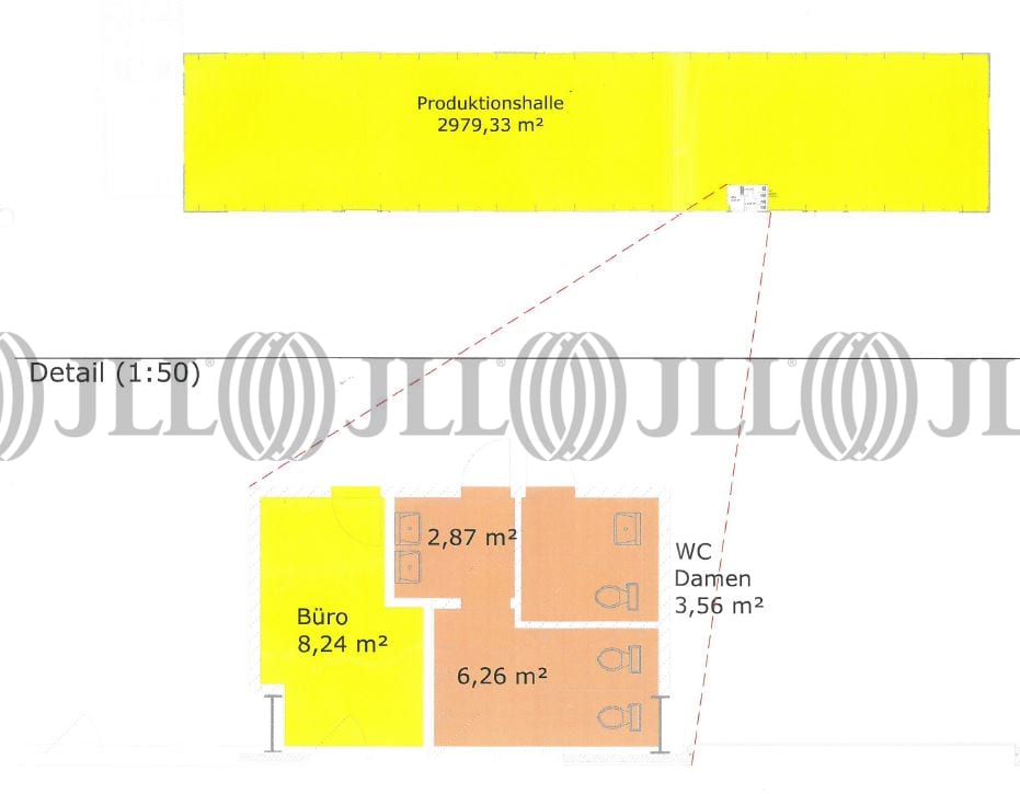 Die Produktionshalle hat einen rechteckigen Grundriss und hat eine nutzbare Höhe von rd. 13 m. Die Halle hat 3 ebenerdige Zufahrtstore, zwei davon seitlich zur Straße, die durch das GI führt, und eines an der Giebelseite zur eingezäunten und befestigten Freifläche, die zum Gebäude gehört.